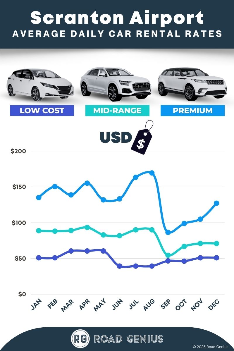 On average, car rentals at Scranton Airport cost around $88 per day, with the lowest-priced rentals starting at $39 per day.