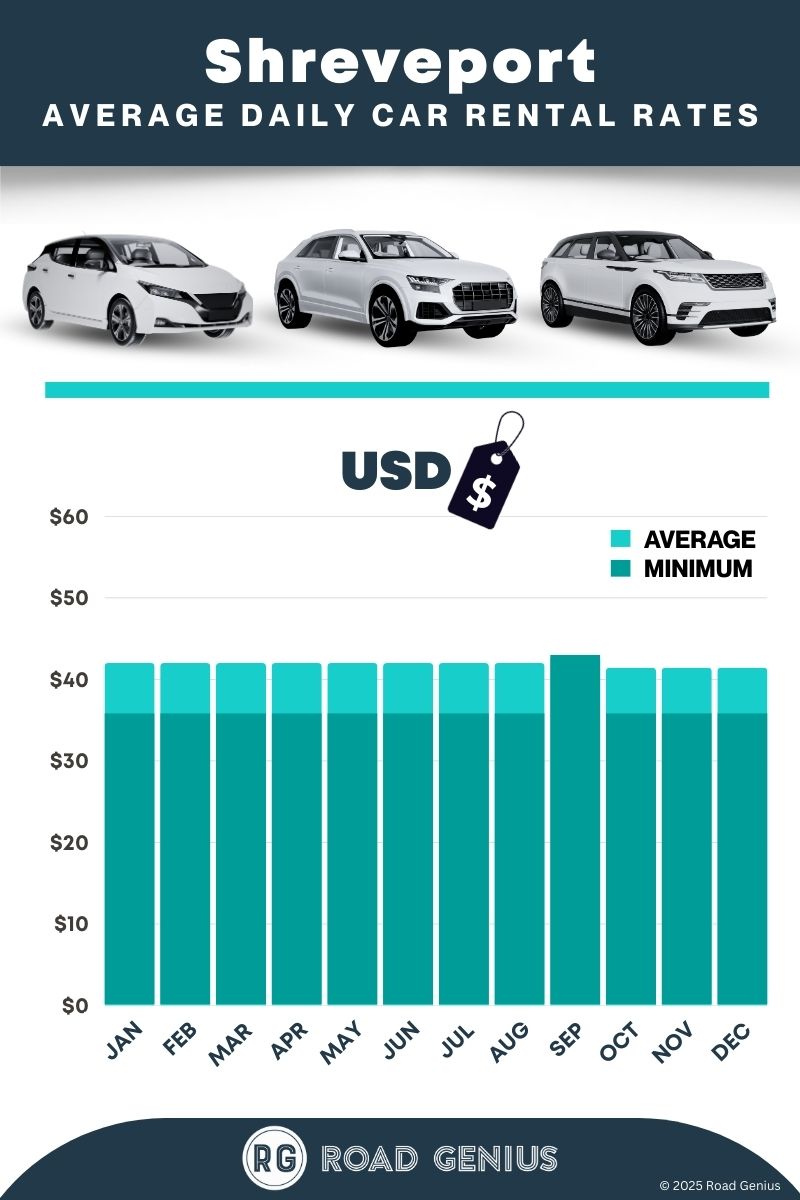 On average, car rentals in Shreveport cost around $41 per day, with the lowest-priced rentals starting at $36 per day.