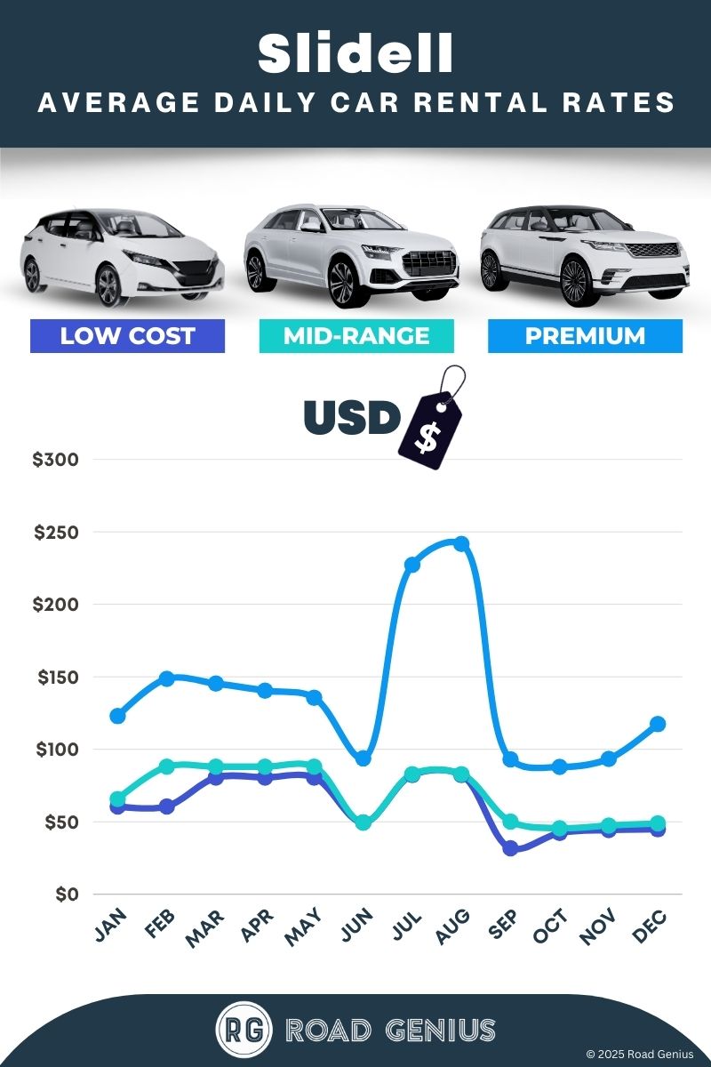 On average, car rentals in Slidell cost around $89 per day, with the lowest-priced rentals starting at $32 per day.