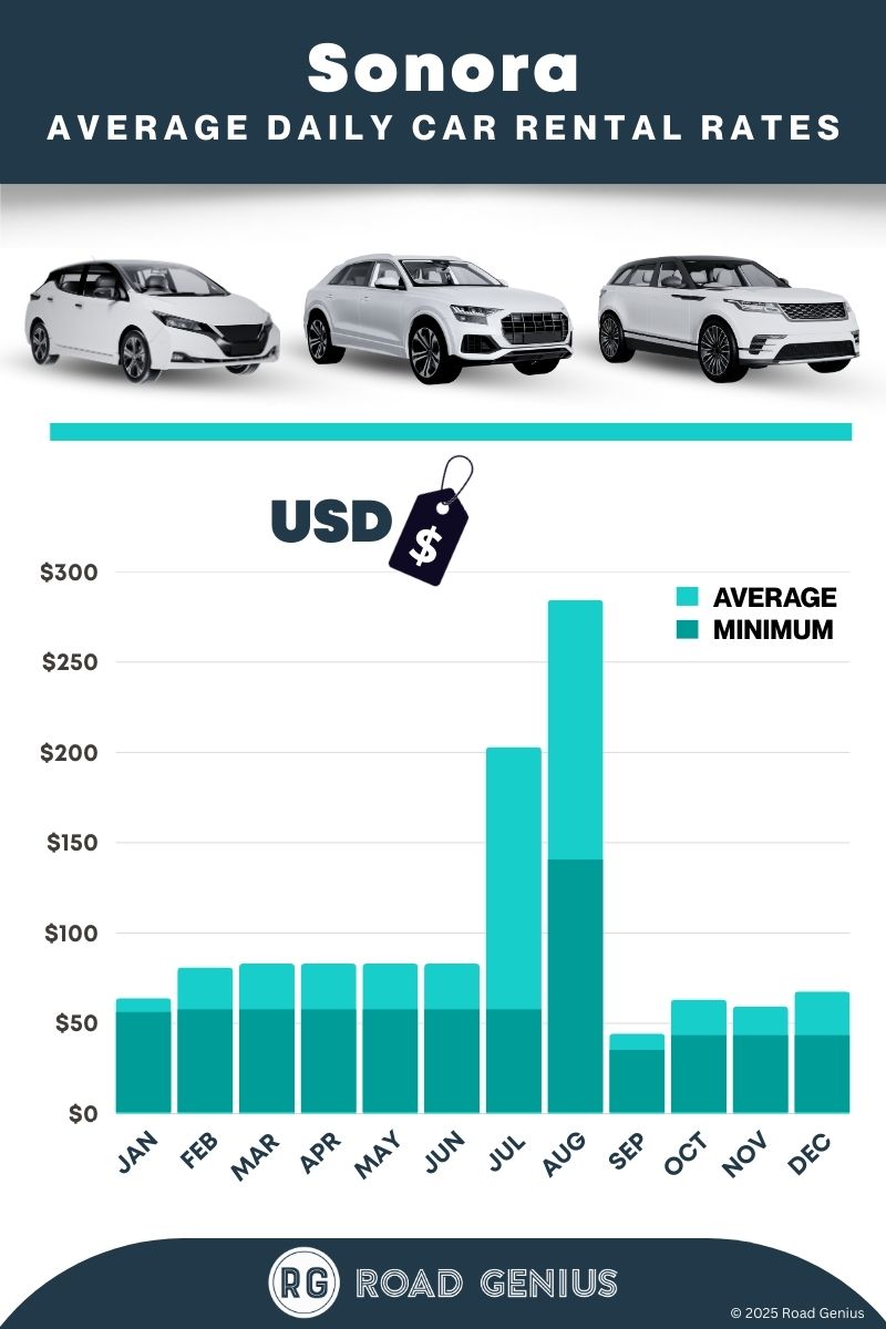On average, car rentals in Sonora cost around $80 per day, with the lowest-priced rentals starting at $35 per day.