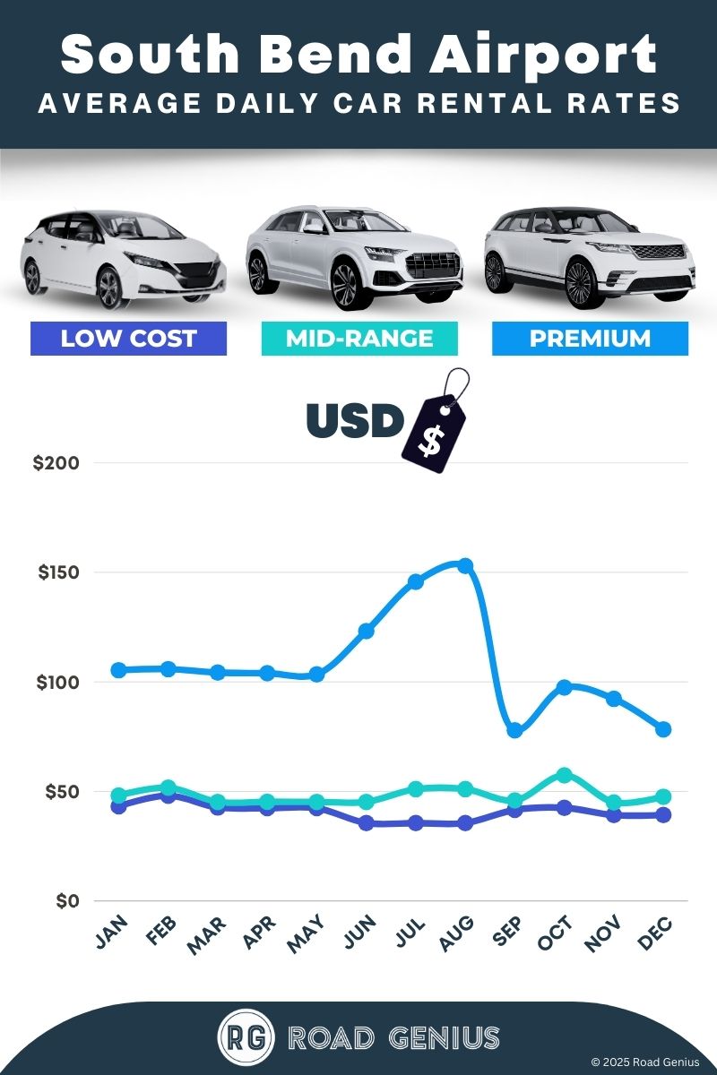 On average, car rentals at South Bend Airport cost around $65 per day, with the lowest-priced rentals starting at $36 per day.