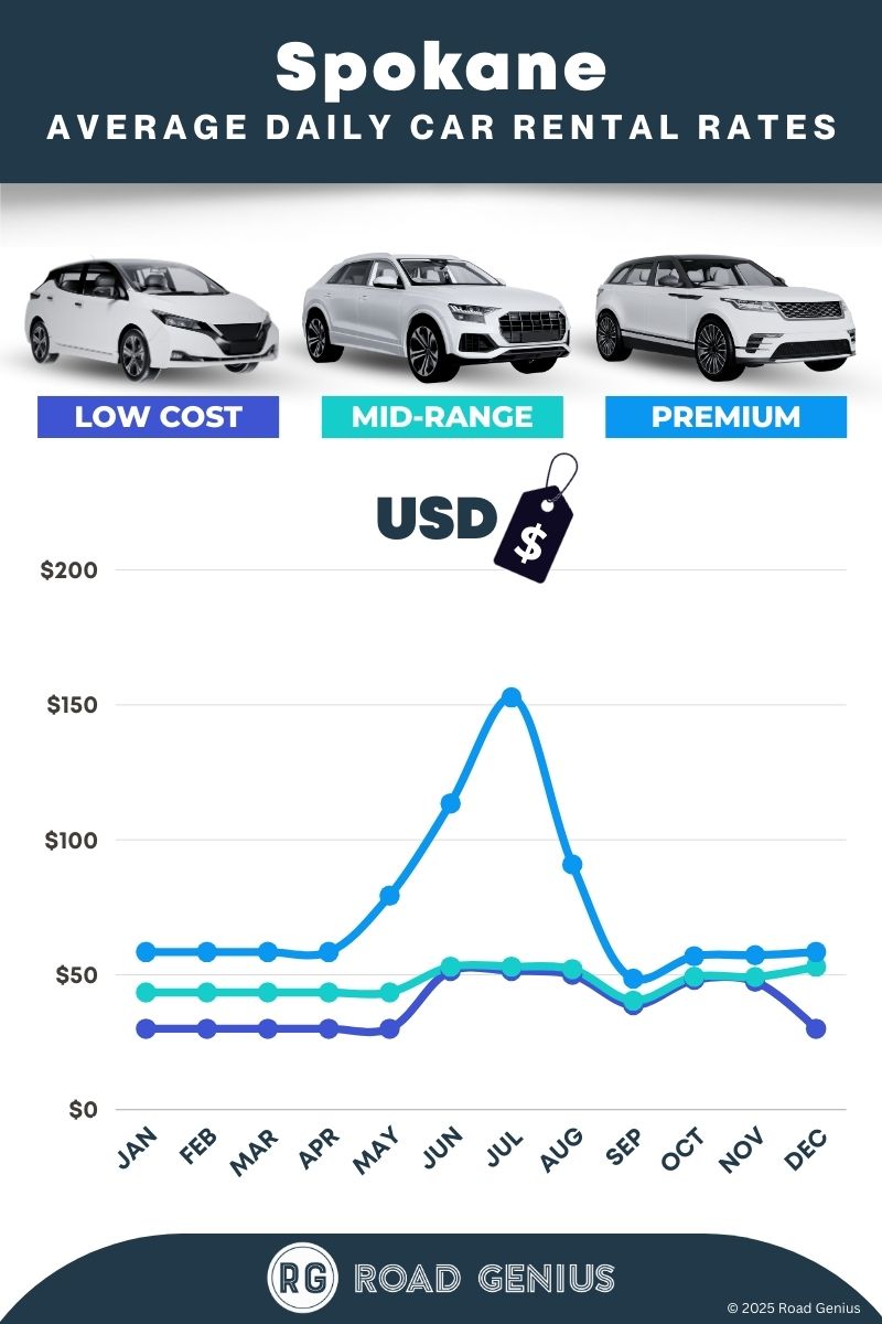 On average, car rentals in Spokane cost around $53 per day, with the lowest-priced rentals starting at $30 per day.
