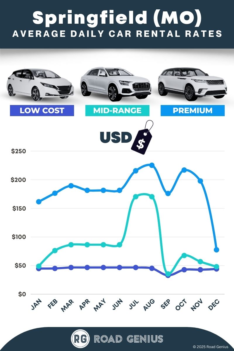 On average, car rentals in Springfield (MO) cost around $104 per day, with the lowest-priced rentals starting at $33 per day.
