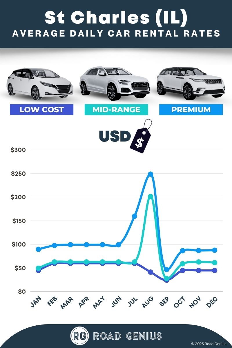 On average, car rentals in St Charles (IL) cost around $76 per day, with the lowest-priced rentals starting at $24 per day.