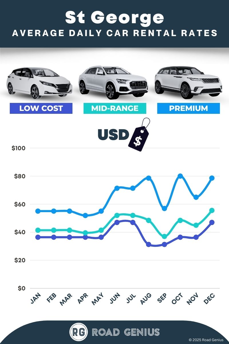 On average, car rentals in St George cost around $49 per day, with the lowest-priced rentals starting at $31 per day.