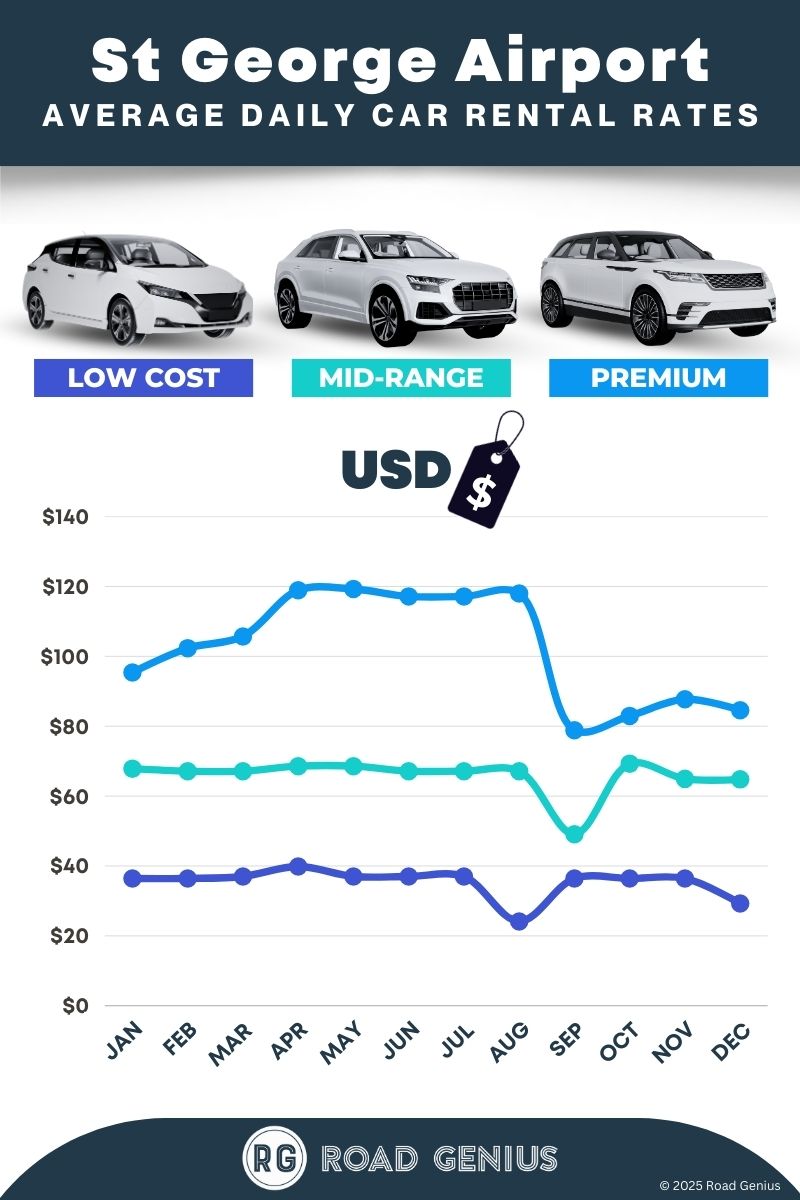 On average, car rentals at St George Airport cost around $68 per day, with the lowest-priced rentals starting at $24 per day.