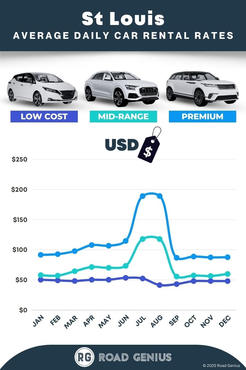 On average, car rentals in St Louis cost around $77 per day, with the lowest-priced rentals starting at $41 per day.