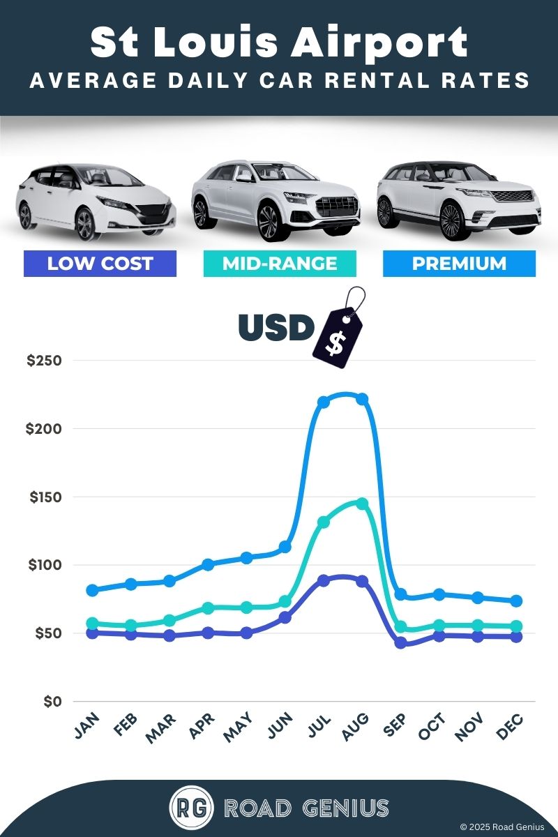 On average, car rentals at St Louis Airport cost around $80 per day, with the lowest-priced rentals starting at $43 per day.