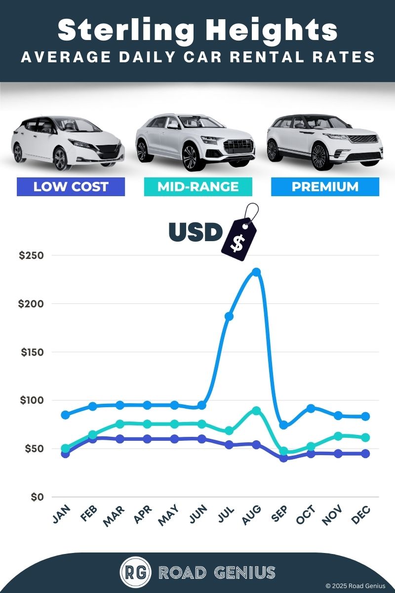 On average, car rentals in Sterling Heights cost around $76 per day, with the lowest-priced rentals starting at $40 per day.
