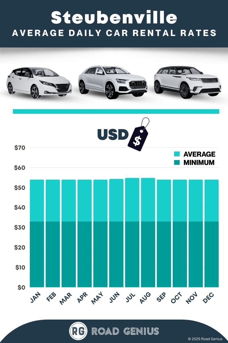 On average, car rentals in Steubenville cost around $55 per day, with the lowest-priced rentals starting at $33 per day.