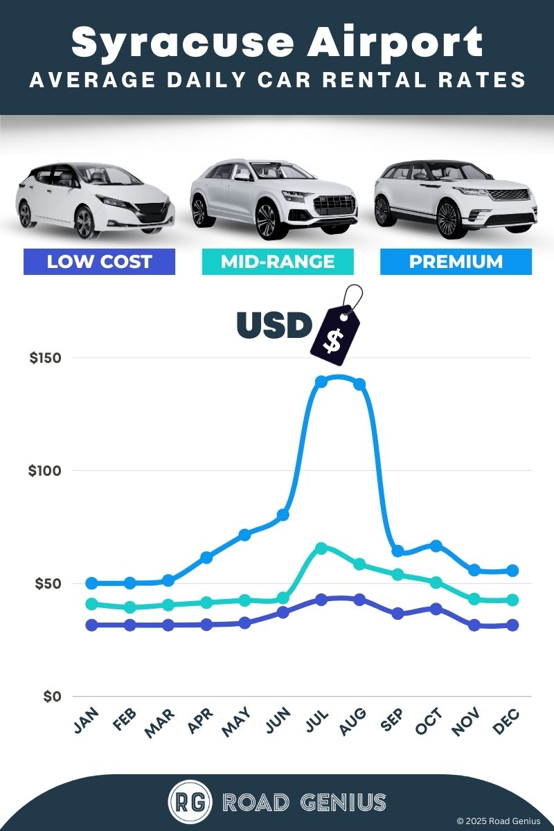 On average, car rentals at Syracuse Airport cost around $52 per day, with the lowest-priced rentals starting at $32 per day.