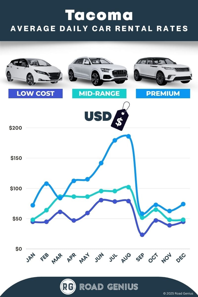 On average, car rentals in Tacoma cost around $78 per day, with the lowest-priced rentals starting at $23 per day.
