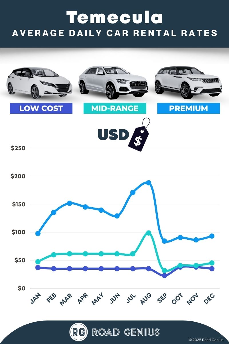 On average, car rentals in Temecula cost around $72 per day, with the lowest-priced rentals starting at $23 per day.