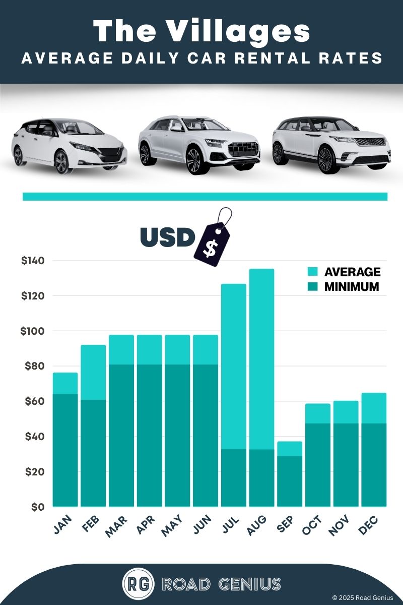 On average, car rentals in The Villages cost around $76 per day, with the lowest-priced rentals starting at $29 per day.