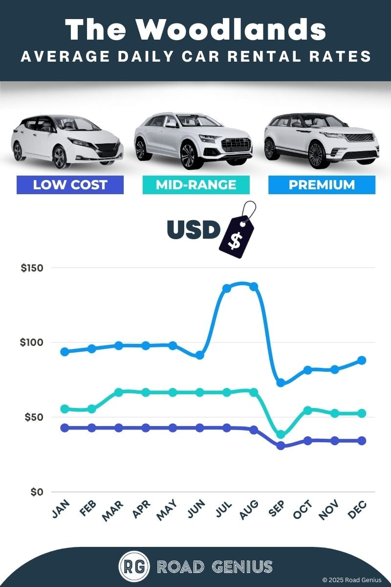 On average, car rentals in The Woodlands cost around $65 per day, with the lowest-priced rentals starting at $31 per day.