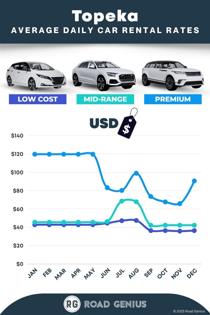 On average, car rentals in Topeka cost around $62 per day, with the lowest-priced rentals starting at $36 per day.