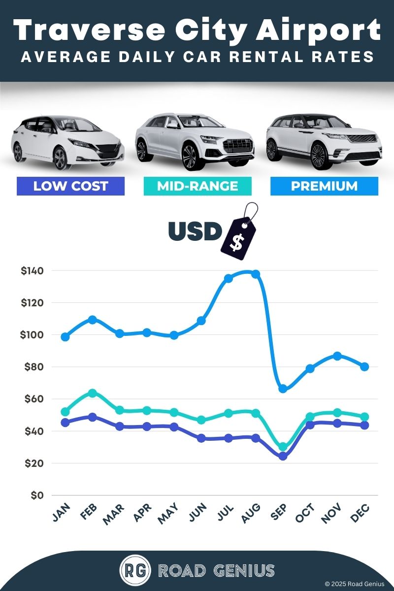 On average, car rentals at Traverse City Airport cost around $64 per day, with the lowest-priced rentals starting at $24 per day.