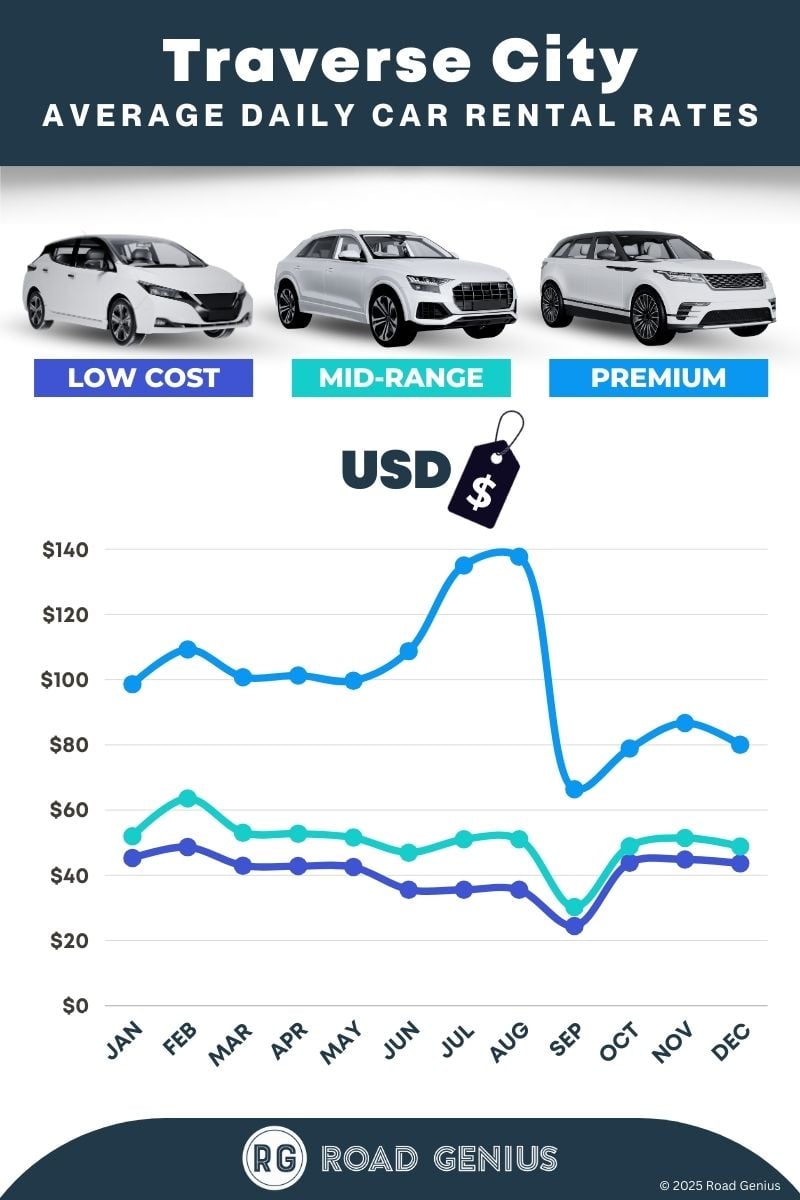 On average, car rentals in Traverse City cost around $64 per day, with the lowest-priced rentals starting at $24 per day.