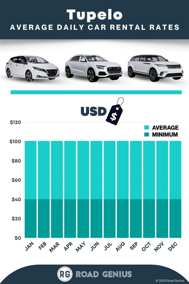 On average, car rentals in Tupelo cost around $80 per day, with the lowest-priced rentals starting at $33 per day.