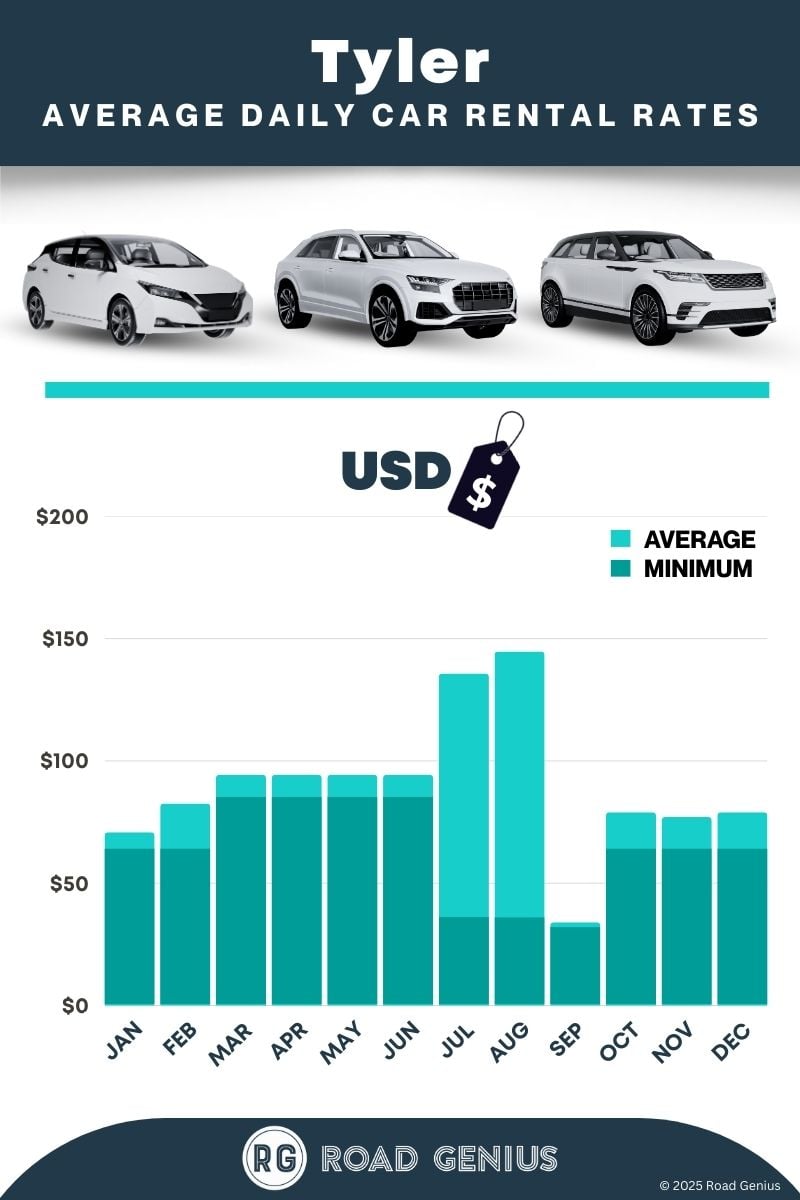 On average, car rentals in Tyler cost around $81 per day, with the lowest-priced rentals starting at $32 per day.