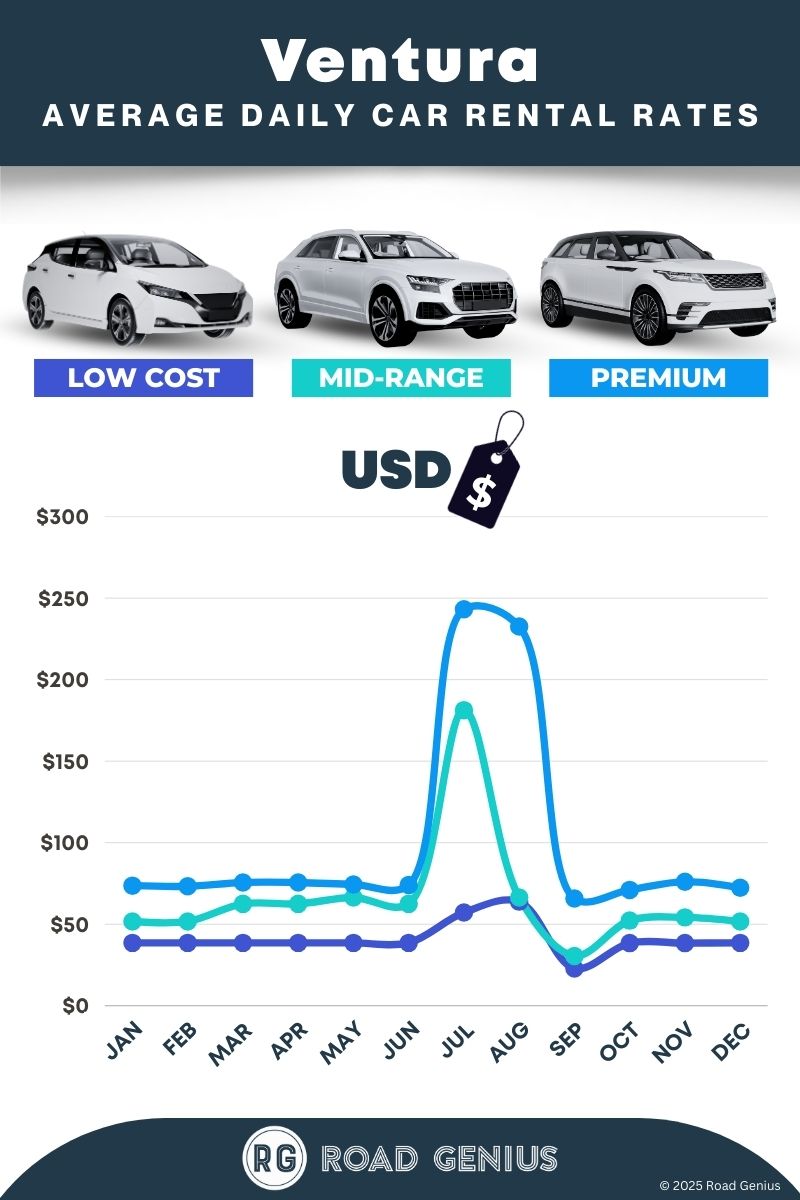 On average, car rentals in Ventura cost around $69 per day, with the lowest-priced rentals starting at $23 per day.