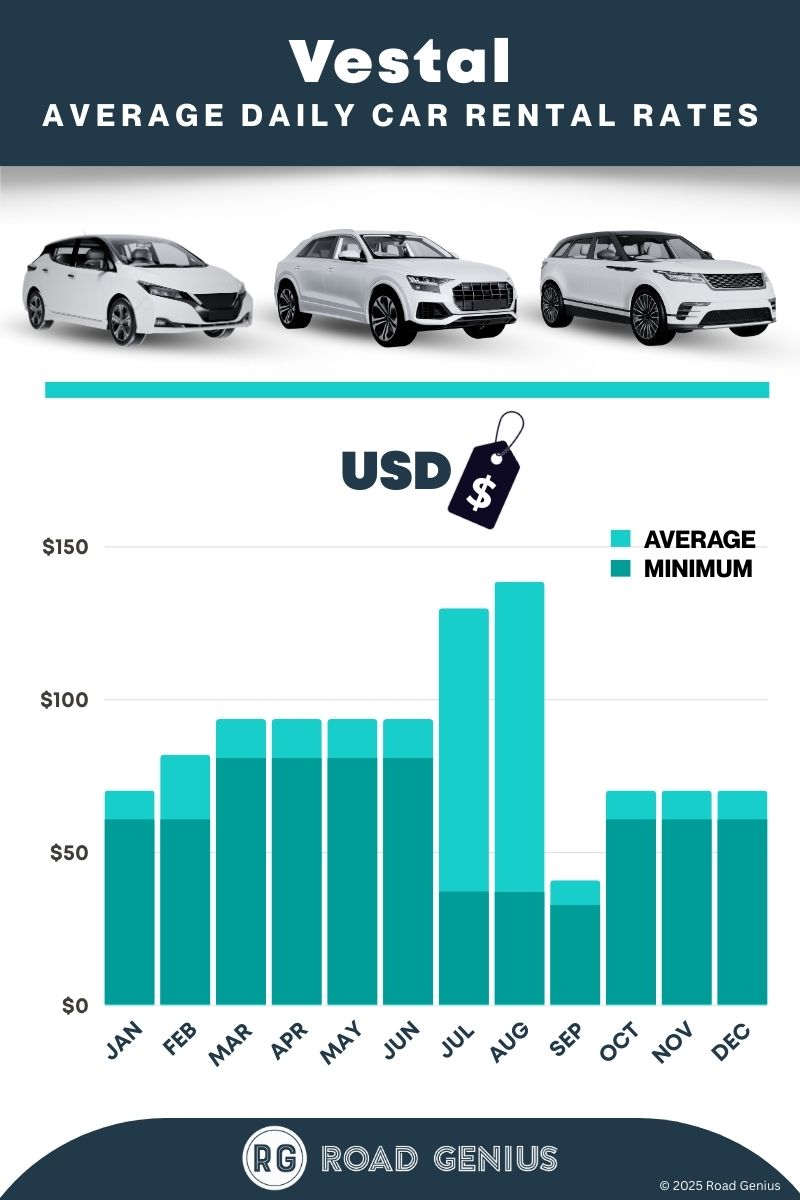 On average, car rentals in Vestal cost around $78 per day, with the lowest-priced rentals starting at $33 per day.