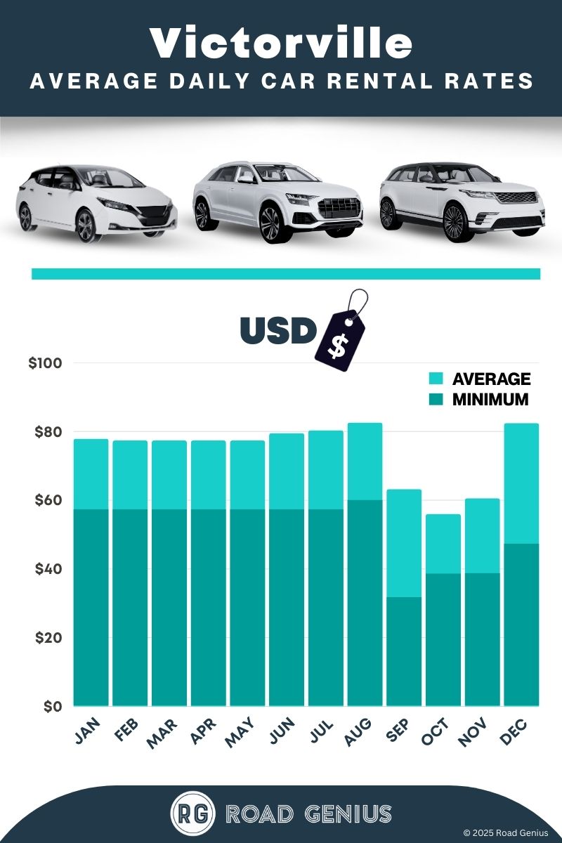 On average, car rentals in Victorville cost around $69 per day, with the lowest-priced rentals starting at $32 per day.