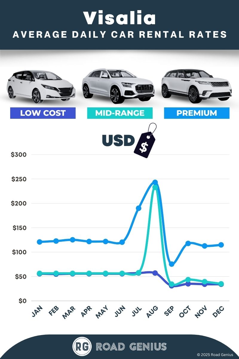 On average, car rentals in Visalia cost around $82 per day, with the lowest-priced rentals starting at $31 per day.