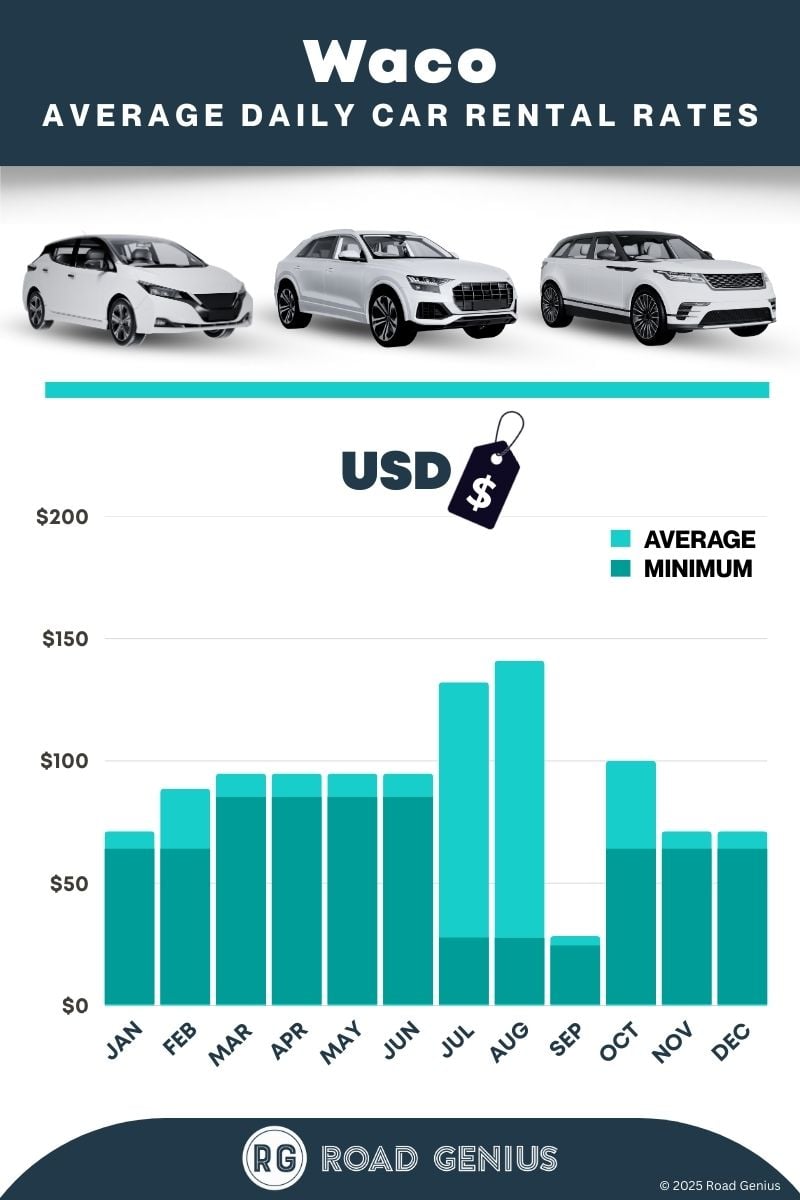 On average, car rentals in Waco cost around $79 per day, with the lowest-priced rentals starting at $24 per day.