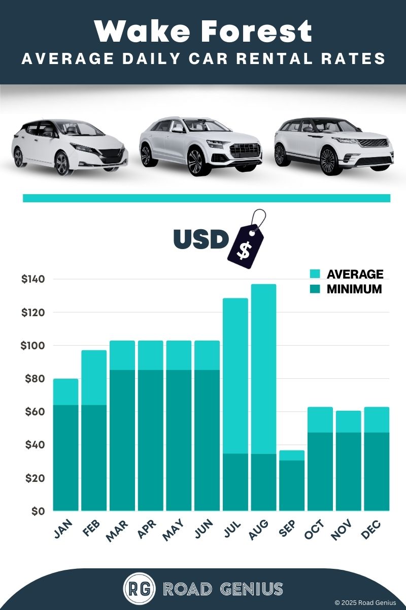 On average, car rentals in Wake Forest cost around $77 per day, with the lowest-priced rentals starting at $30 per day.