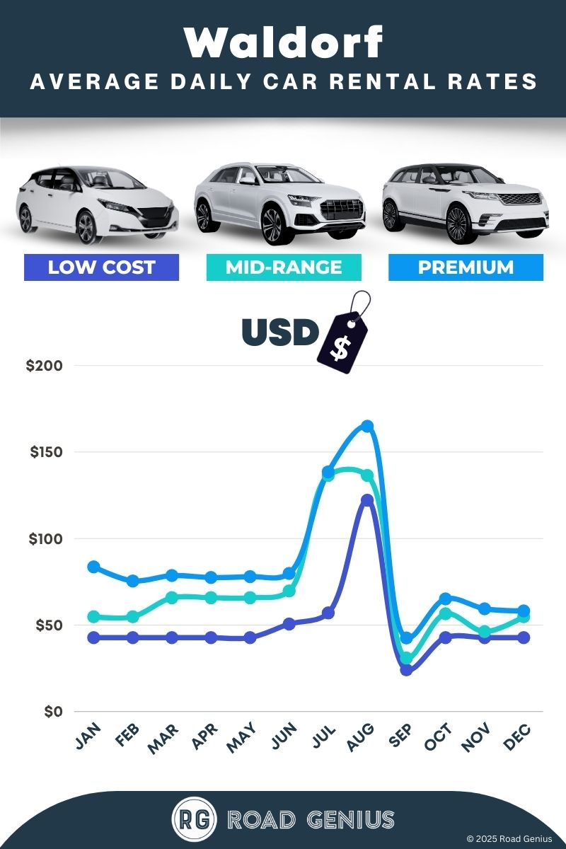 On average, car rentals in Waldorf cost around $68 per day, with the lowest-priced rentals starting at $24 per day.
