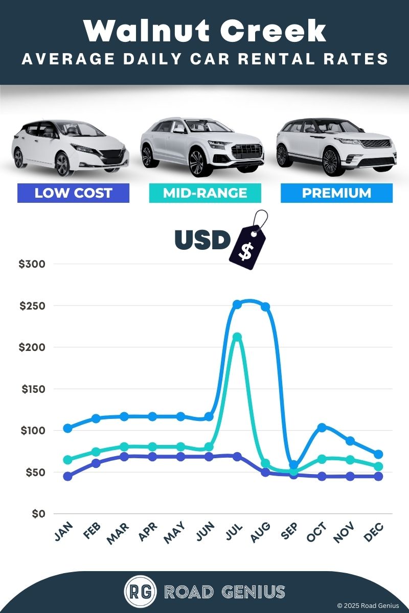 On average, car rentals in Walnut Creek cost around $88 per day, with the lowest-priced rentals starting at $45 per day.