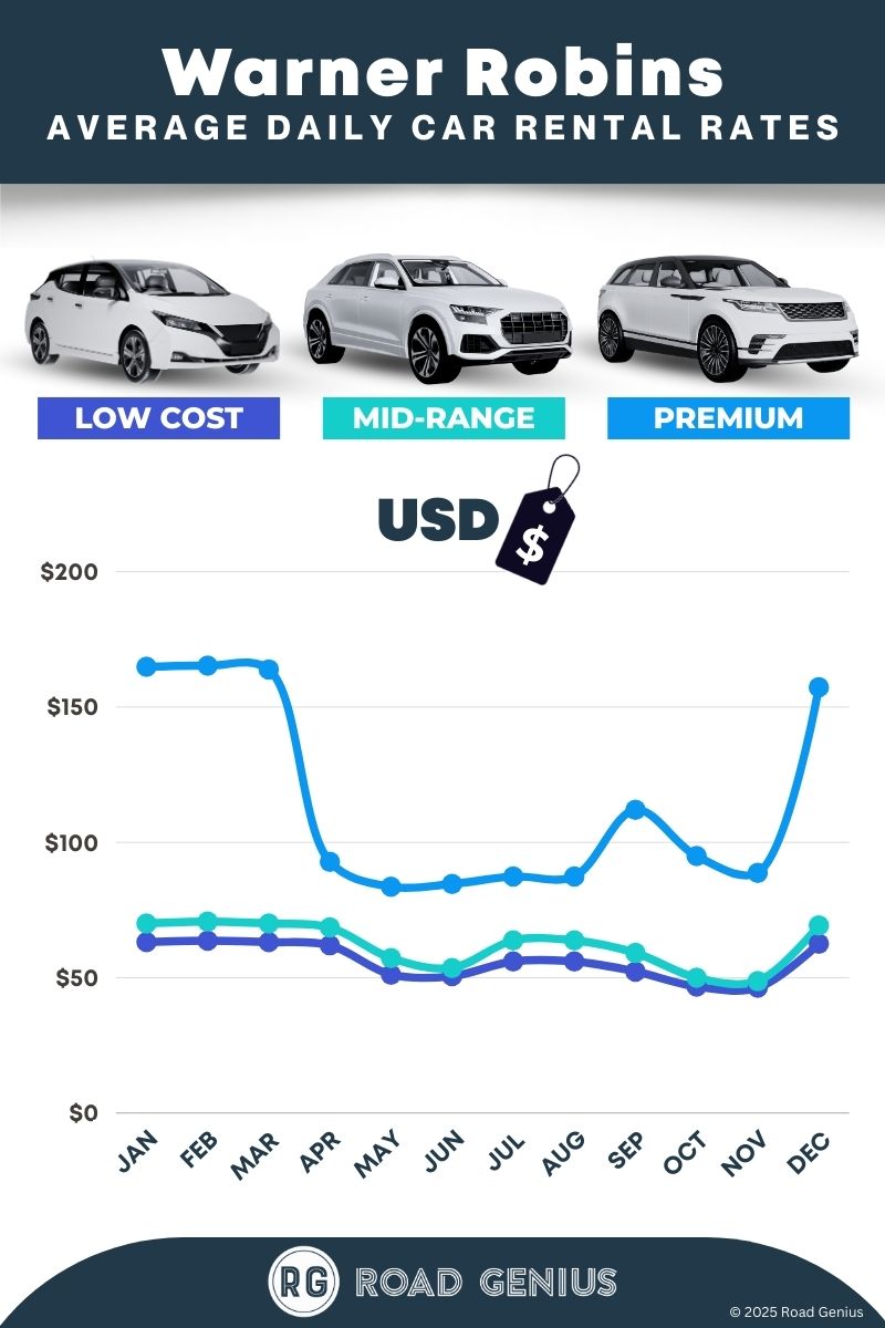 On average, car rentals in Warner Robins cost around $78 per day, with the lowest-priced rentals starting at $46 per day.