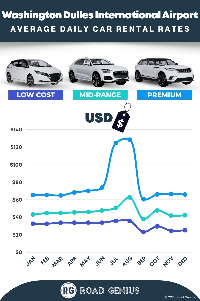 On average, car rentals at Washington Dulles International Airport cost around $51 per day, with the lowest-priced rentals starting at $23 per day.