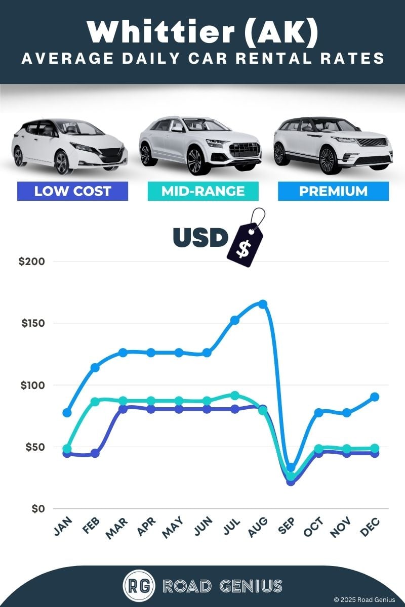 On average, car rentals in Whittier (AK) cost around $79 per day, with the lowest-priced rentals starting at $22 per day.