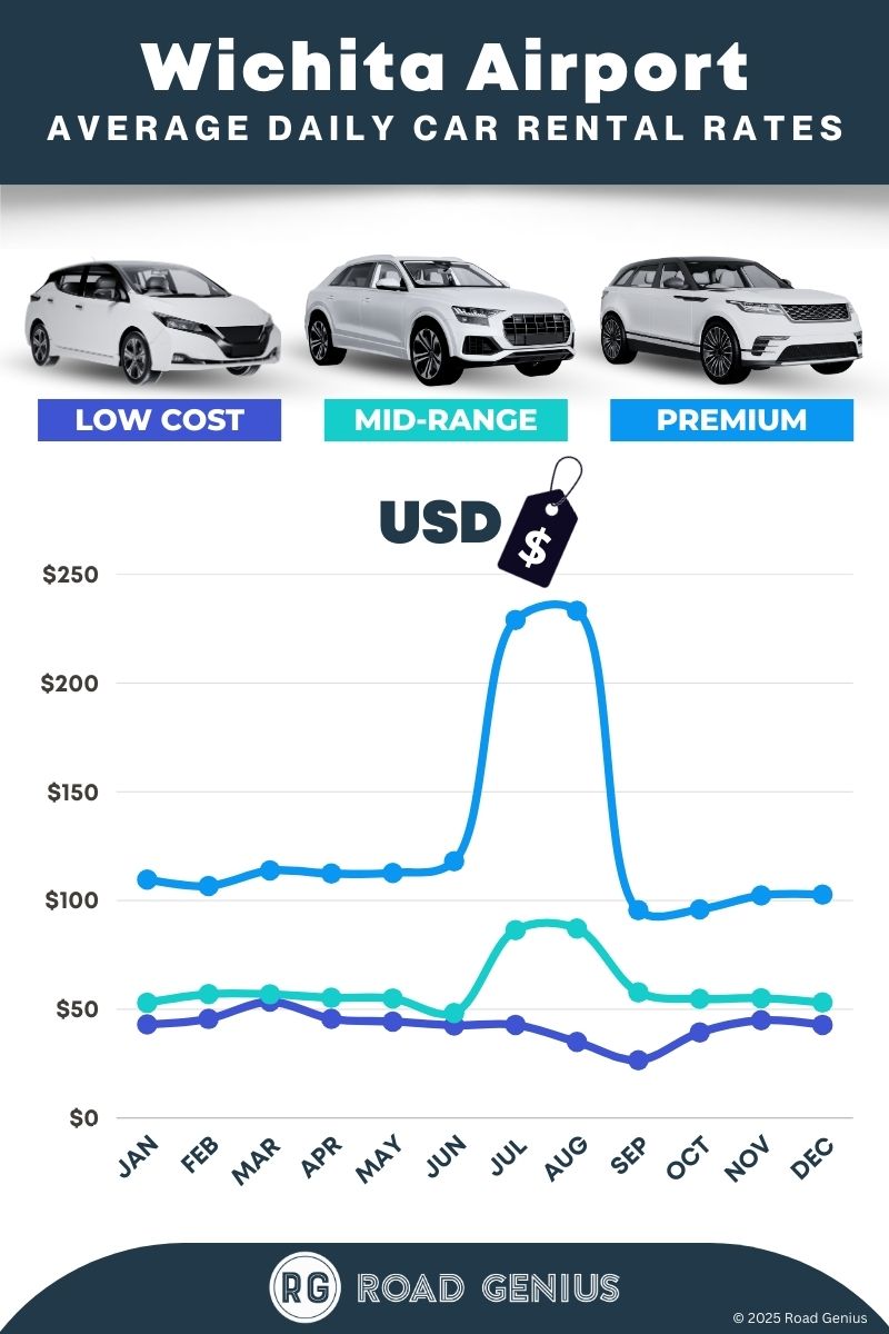 On average, car rentals at Wichita Airport cost around $77 per day, with the lowest-priced rentals starting at $27 per day.