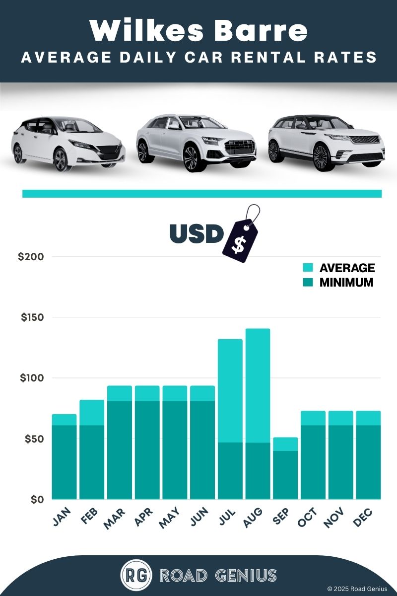 On average, car rentals in Wilkes Barre cost around $79 per day, with the lowest-priced rentals starting at $41 per day.