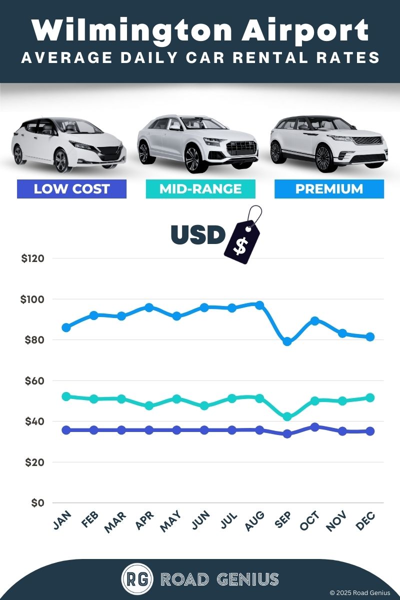 On average, car rentals at Wilmington Airport cost around $58 per day, with the lowest-priced rentals starting at $34 per day.