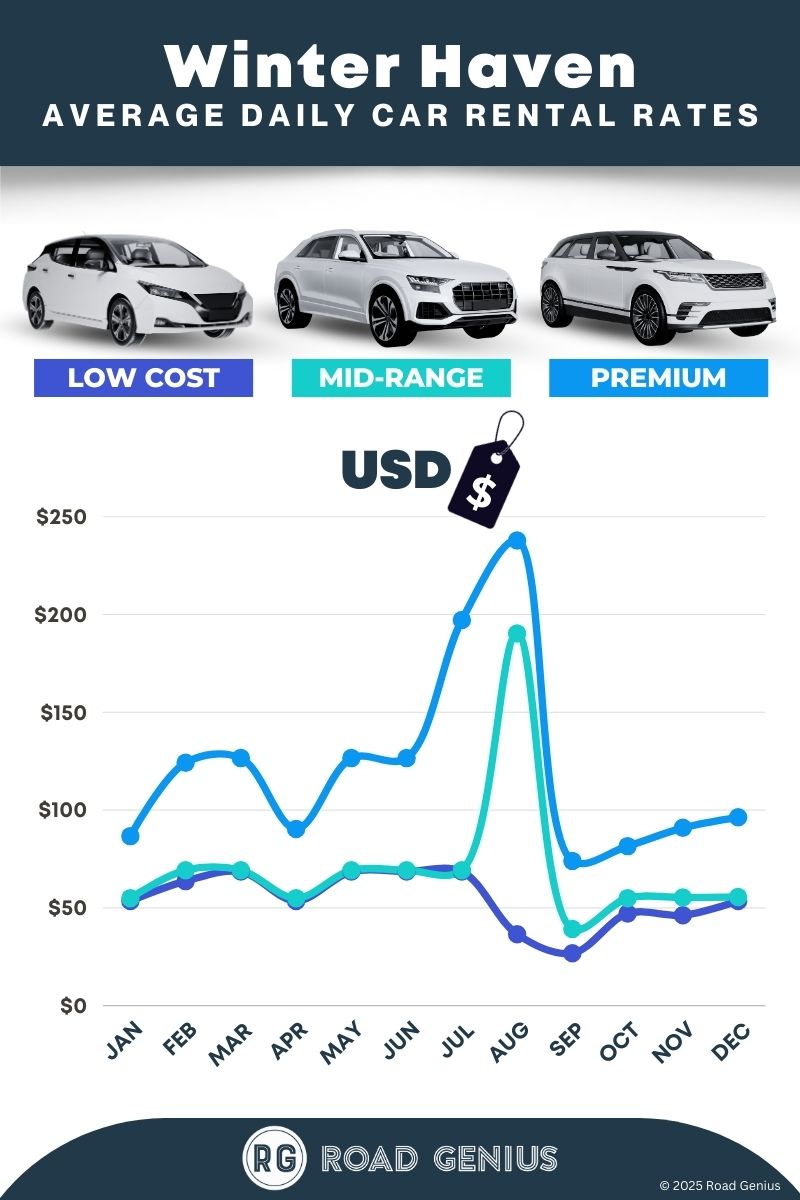 On average, car rentals in Winter Haven cost around $82 per day, with the lowest-priced rentals starting at $27 per day.
