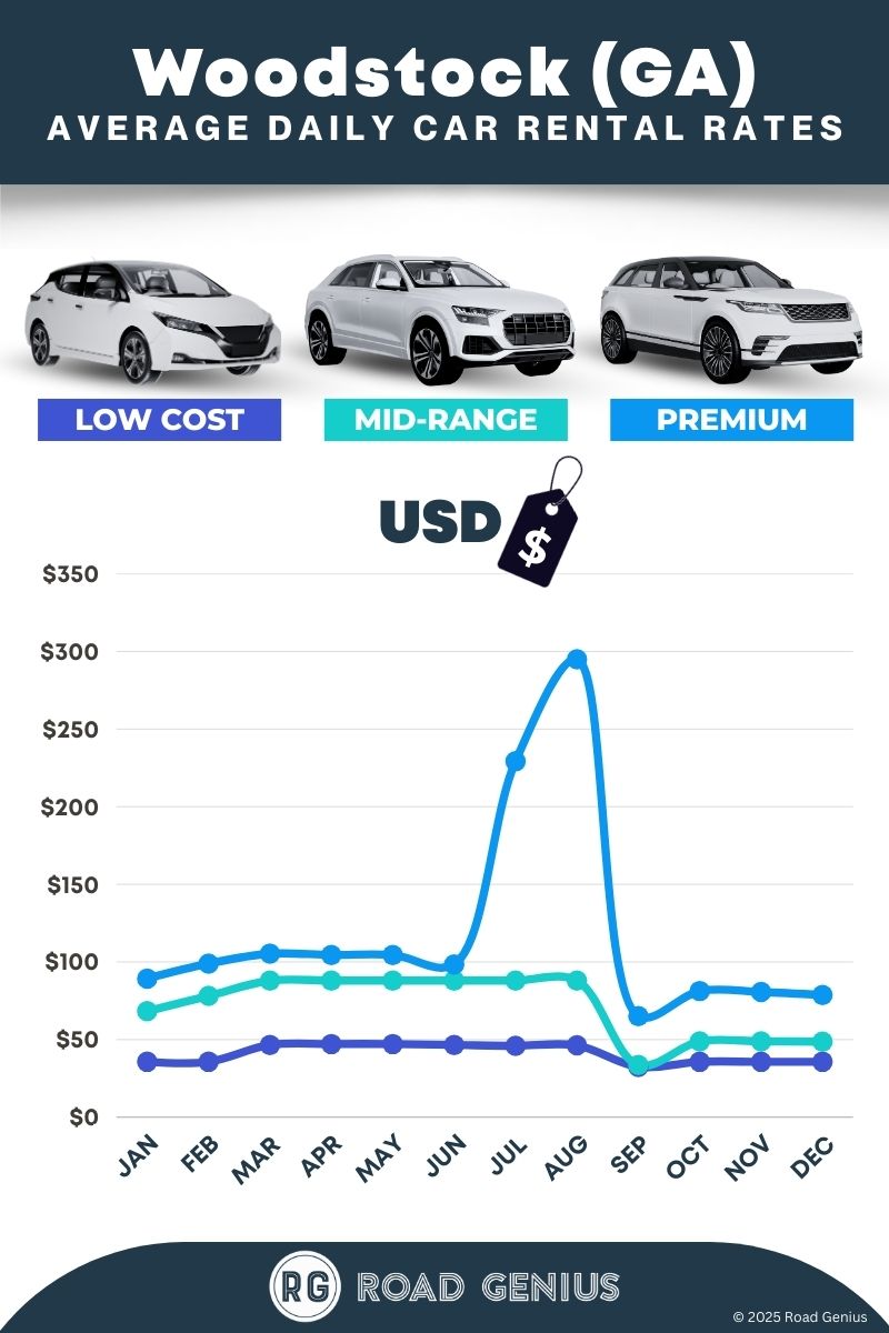 On average, car rentals in Woodstock (GA) cost around $77 per day, with the lowest-priced rentals starting at $32 per day.