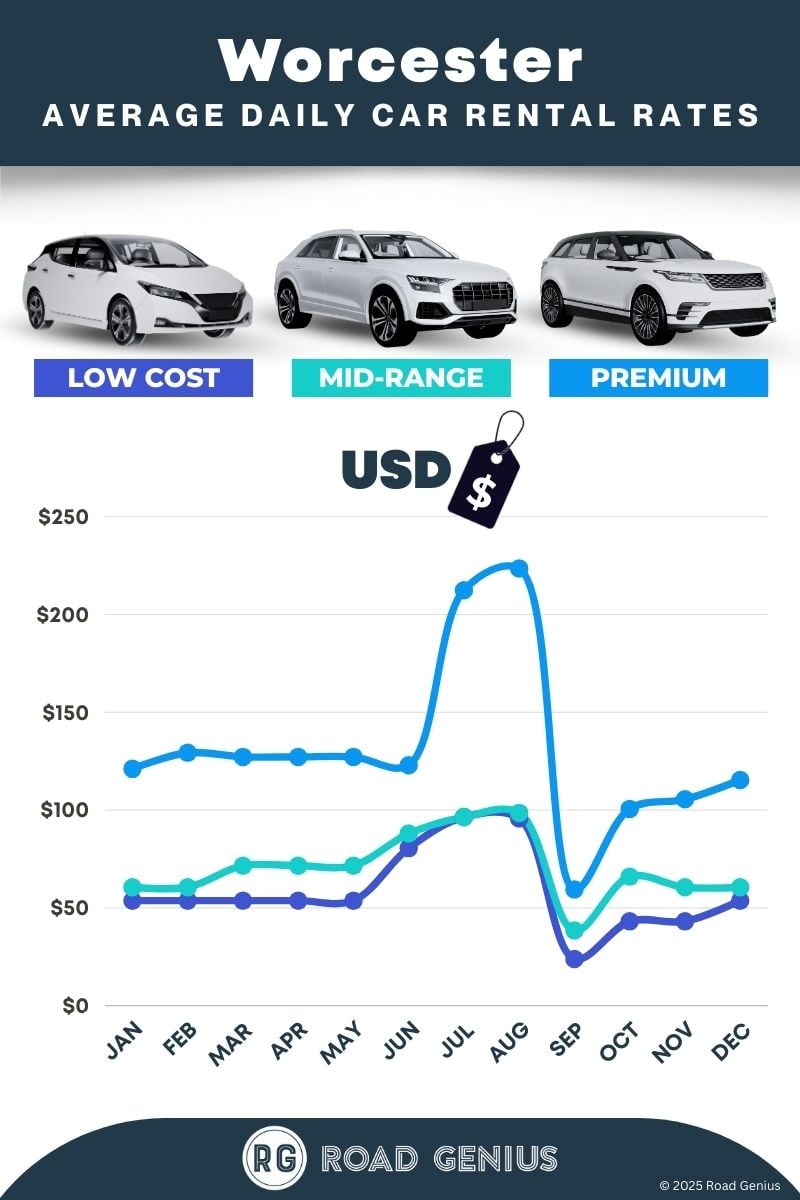 On average, car rentals in Worcester cost around $87 per day, with the lowest-priced rentals starting at $24 per day.