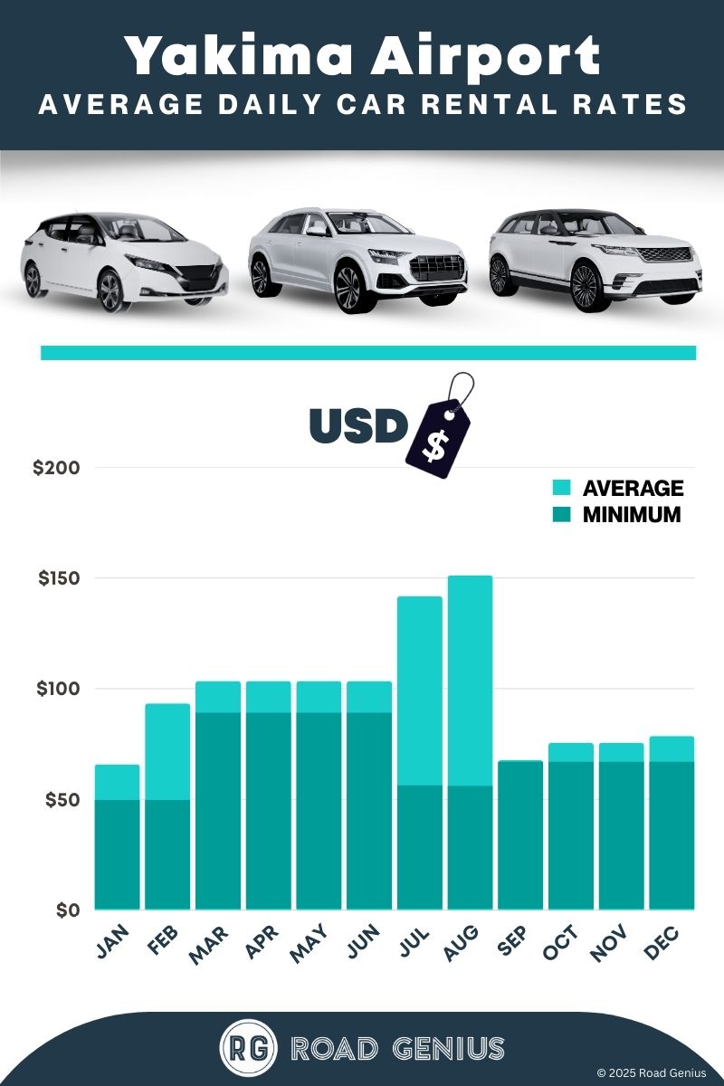 On average, car rentals at Yakima Airport cost around $85 per day, with the lowest-priced rentals starting at $49 per day.