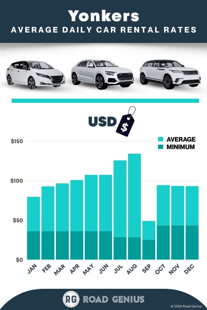 On average, car rentals in Yonkers cost around $75 per day, with the lowest-priced rentals starting at $25 per day.