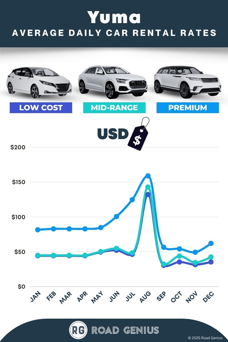 On average, car rentals in Yuma cost around $62 per day, with the lowest-priced rentals starting at $31 per day.