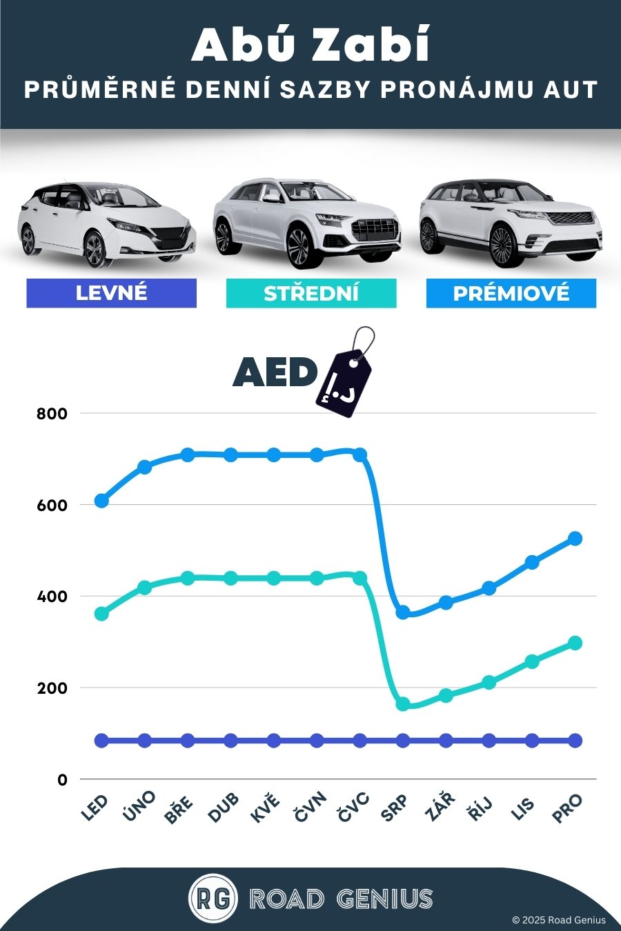 Průměrně stojí pronájem auta v Abú Zabí přibližně 362 AED za den, přičemž nejlevnější pronájmy jsou k dispozici od 39 AED za den.