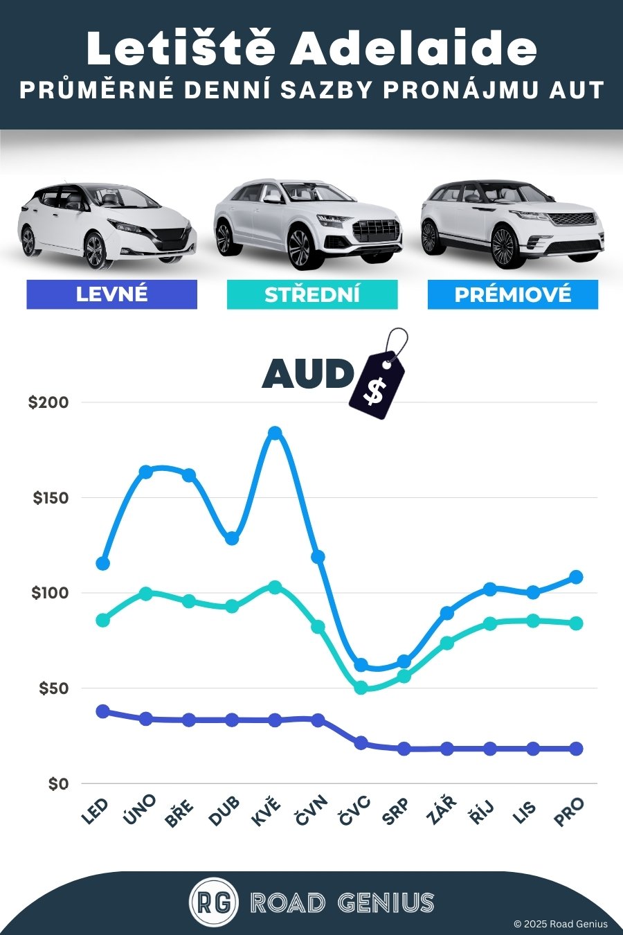 V průměru stojí pronájem auta na letišti v Adelaide (ADL) zhruba 100 AUD za den, přičemž nejlevnější pronájmy začínají na 18 AUD za den.