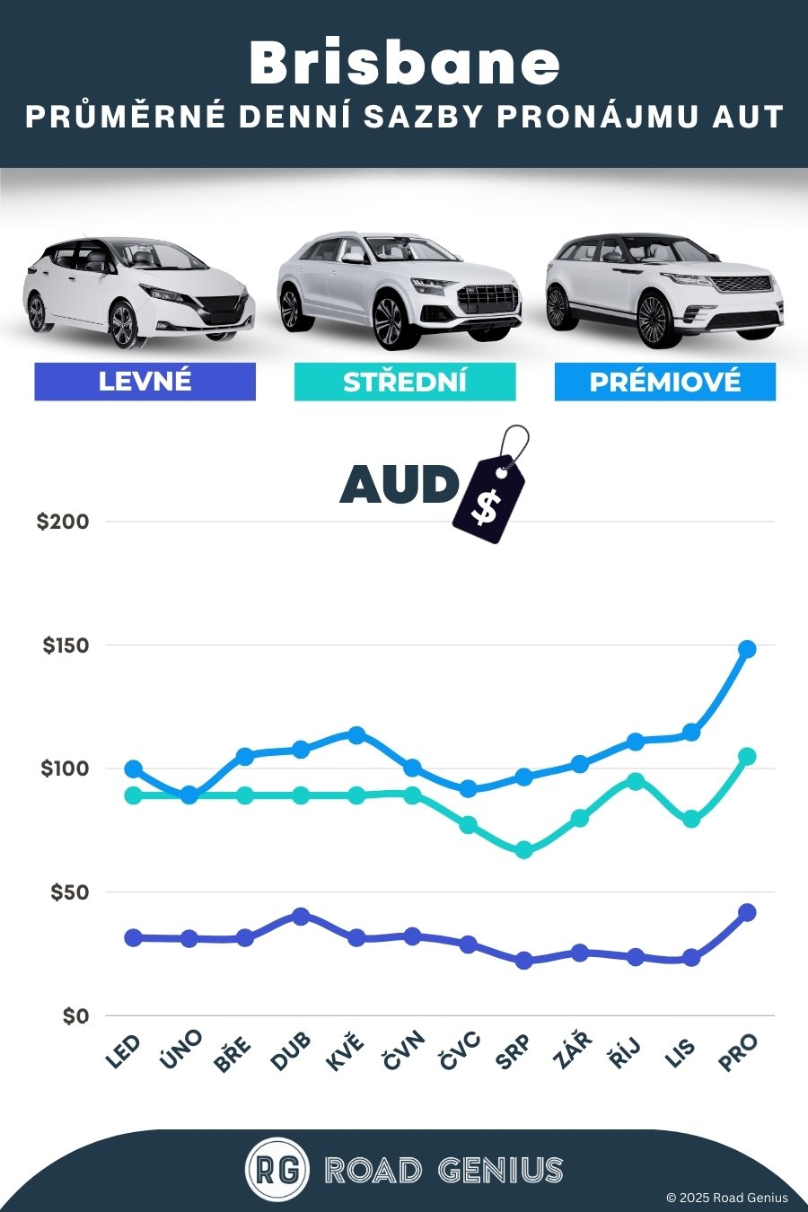 V průměru stojí pronájem auta v Brisbane zhruba 95 AUD za den, přičemž nejlevnější pronájmy jsou k dispozici od 22 AUD za den.