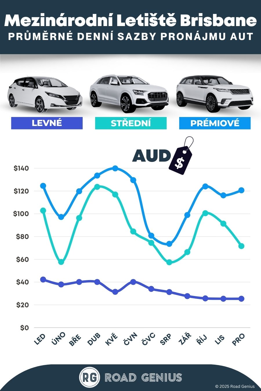 Průměrně vyjde pronájem auta na letišti v Brisbane (BNE) zhruba na 103 AUD za den, přičemž nejlevnější pronájmy začínají na 25 AUD za den.