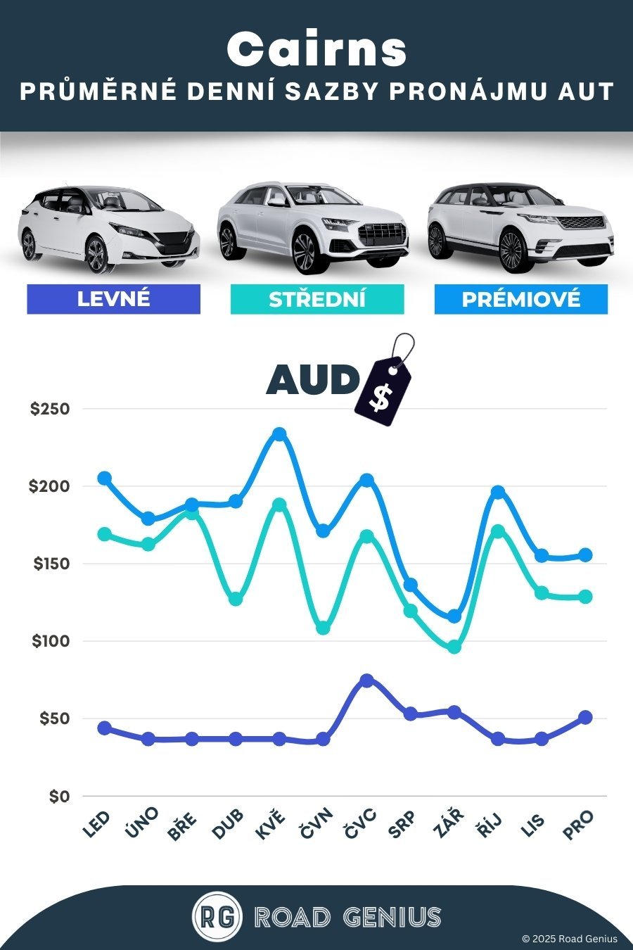 Průměrně stojí pronájem auta v Cairns přibližně 157 AUD za den, přičemž nejlevnější pronájmy jsou k dispozici od 37 AUD za den.