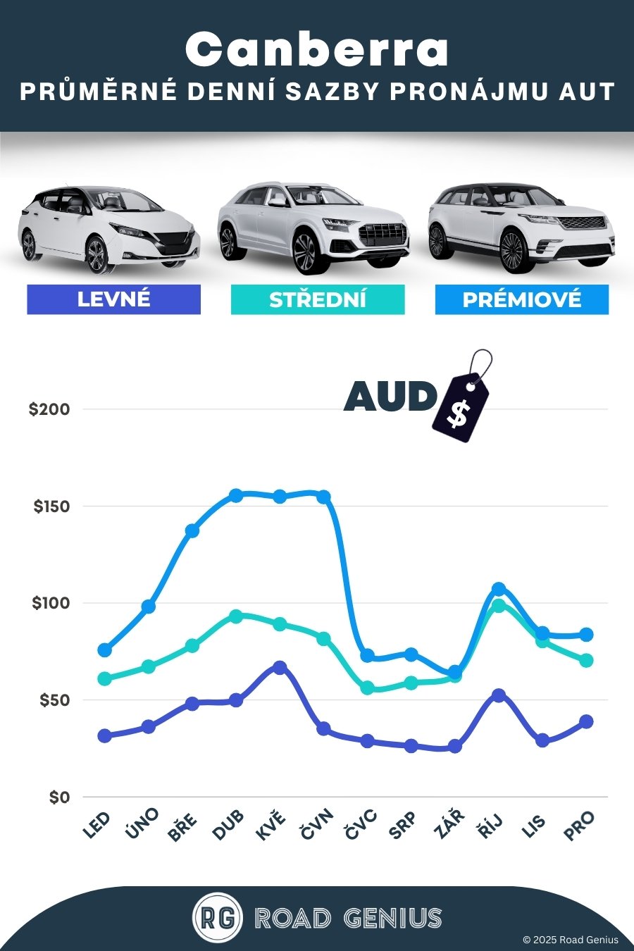 Pronájem auta v Canbeře stojí v průměru přibližně 85 AUD za den, přičemž nejlevnější pronájmy jsou k dispozici od 26 AUD za den.